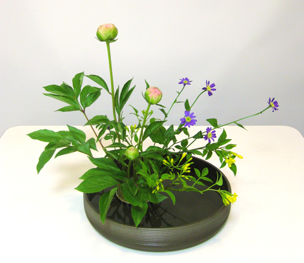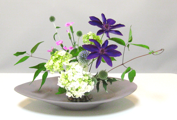 皐月のいけばなの花材は 黄素馨(きそけい)、芍薬(しゃくやく)、都忘れ 芍薬はまだ堅いつぼみなので、 ちょっと華やかさはないですが、 緑がきれいな花材でした〜。 驚いたことに、ピンクだと思っていた芍薬は、 花が開いたら白でした。 私は、母に日に せっかくだから華やかなのをと、 牡丹とか芍薬とかを送ります。 薔薇とはまた違う華やかさが好き。 水盤には、水に映るような感じで 生けていきます。 どうも、キツキツに生けてしまうので、 「風が通るような」生け方を目指さなくちゃね。 水無月の花材は、 紫陽花、鉄線、瑠璃玉薊(るりたまあざみ)、撫子 鉄線は夏らしくていいですよね〜。 そうだ、来年は鉄線育ててみようかな。 瑠璃玉薊がかわいい。 小さな花がてっぺんから咲くのです。 こういった種類の多いときは、 あれもコレもと欲張らず 「何を1番見せたいのか」を意識しなくちゃいけないそうです。 それから、バランスも張り出した逆の方向に、 引きを入れる。 うむむ、デザインと同じですね〜。 紫陽花(あじさい)の八重咲く如く、 弥(や)つ代にを、いませわが背子、見つつ思(しの)はぬ ーーー万葉集・橘諸兄