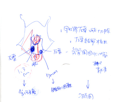 ってよく聞かれるけど ほんとになんにもなかった。 乳頭ガンをはじめ甲状腺の腫瘍一般は 基本的にはしこりがある程度。 全体的な腫れはかすかにあったけど いわれなければ気づかない程度だったし、 しこりに関しては、 「かなりわかりにくい」と先生に言われていたぐらいだから 自分では当然わからず。 じゃ、甲状腺機能低下症いわゆる橋本病のほうはどうかというと、 基本的な症状は ●むくみ(押しても元に戻る) ●皮膚がカサカサ ●寒がり ●食欲がなくても太る ●無気力 ●物忘れがひどい ●眠い ●髪が抜ける って、どれも当てはまるんですケド(苦笑) っていうか、これ、ある程度年齢がいったら みんな当てはまっちゃうんじゃないだろうか? ようするに、「老化現象」みたいなもんなんですね。 まぁ、病理的にはここ数年急激に上がったコレステロール値が 唯一それらしき症状だったのかも。 (コレステロール値があがるんですって) 先生に聞いてみたら 橋本病でも必ずしも症状が出るとは限らず、 私の場合は、エコーでそれらしき症状 (全体的に肥大、エコーで見ると砂のように白い点がたくさんある)で 判断されたらしい。 母の方はといえば、全摘の手術も無事終わり、 副甲状腺もとったせいで 低カルシウム状態からなかなか回復せず 1ヶ月の入院後、やっと退院。 声もガラガラ。 でも、案外手術のキズはあっというまに回復。 傷の痛みはあまりないとのことだったので、 すこし安心した〜。 つづく PR 検査のあとに説明しながら先生が書いてくれたメモ。 蝶が羽根を開いたような形の甲状腺の右側 右葉といわれる部分に1.3cmの乳頭ガン。 左葉にも鑑別困難(良性か悪性か鑑別が困難)な7mmの腫瘍。 先生いわく、 「1cm程度なら経過観察でもしばらくは大丈夫だけど1.3cm。 微妙だけどどうします?」 もちろん、心配して日々を送るのはイヤだよね〜。 手術内容はこの時点では ●右葉・峡(蝶の真ん中の部分)切除 ●左葉結節核出(左の腫瘍部分だけえぐる) ※でも、後日全摘出に変更 検査の結果を聞きに行ったのが3月、 だいたい6〜8月くらいに入院だろうということになった。 なんと3〜5ヶ月待ちである。 もちろん、個室とか2人部屋とかだったら、 もう少し早く順番が回ってくるんだろうけど 私は何となく気が進まなかった。 理由その1 けっこう寂しがり屋なので 完全に1人なのは精神衛生上良くない 理由その2 2人部屋は、万一同室の人が合わなかったら最悪 理由その3 1泊室料2万だったら、旅行などに使う方が良い。 ということで、とりあえず順番待ちすることにした。 ただ、入院のお知らせはだいたい2日程度前に 突然くるということ!!! うむむ、フリーで仕事をしているし(つまり代わりがいない)、 お姑さんには迷惑かけたくないし という話をしたら、だいたいの要望はきけると思うとのこと。 なので、夏休みと絡めて7月下旬から8月上旬ということをお願いして、 仕事などはそれで段取りをとることにした。 5月には手術前の検査。 全身麻酔なのでその為の 心電図、X線、血液検査、肺活量など 詳しく検査をした。 ちょっと不思議だったのが、 入院が決まって実家の母に電話しなくちゃなぁと思っていたら、 母から電話があった。 「なんか、のどが腫れてきて病院に行こうと思っている。また、甲状腺かも知れない」 「え?私も実は甲状腺で入院決まったよ」 「あら、お互い頑張ろうね」(笑) 母は20年ほど前に甲状腺の半分を摘出したのだけど (良性だったが大きかったので摘出) 結局、今回の検査の結果は私と同じ「乳頭ガン」だった。 ともかく、ウチは家系的に癌になる人が多いので 当然、父と弟はパニック。 揃って電話してきたのだけど 私といえば 「私も同じ癌だよ〜」と 能天気に応えたのでどうしたらいいかわかんなくなったらしい。 父は親戚中に涙の電話をし、 (そりゃそうだ、妻と娘が同時期だし) 弟はあやしげ漢方の医者に相談したらしい。 母は腫れがあったのでほどなく入院となり パニック気味の父と弟に私は必死に説明をし、 一緒に医師の説明も聞きに行って、 やっと父と弟は納得したみたいだった。 つづく